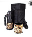 Comes with rear-mounted UV filter, removable camouflage neoprene covers, lens shade and soft case. The case is very impressive; it can be worn like a backpack.